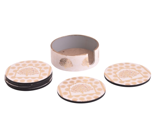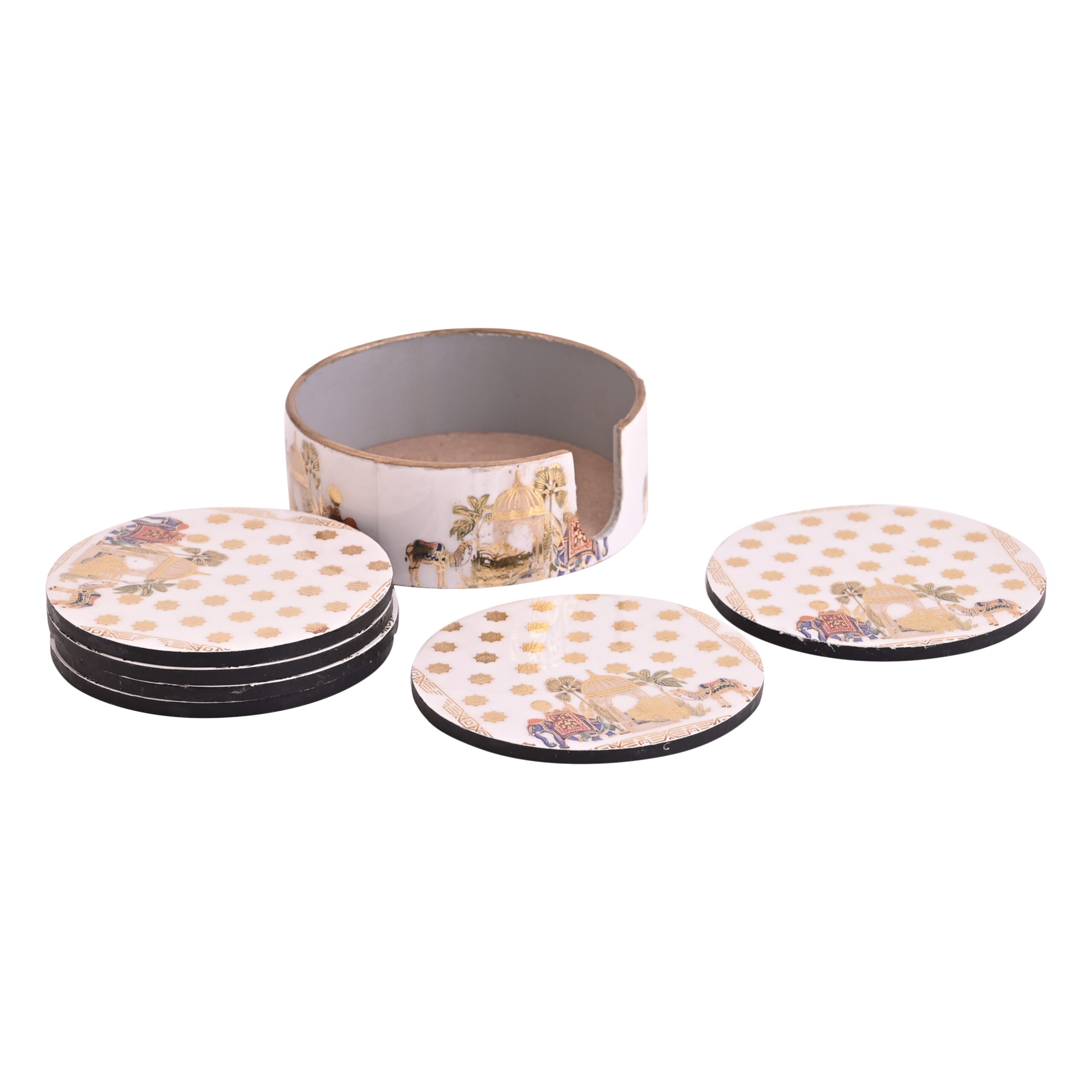Ethnic Round MDF Coaster Set with Holder – 6 Pcs Royal Print Drink Coasters for Tea & Coffee