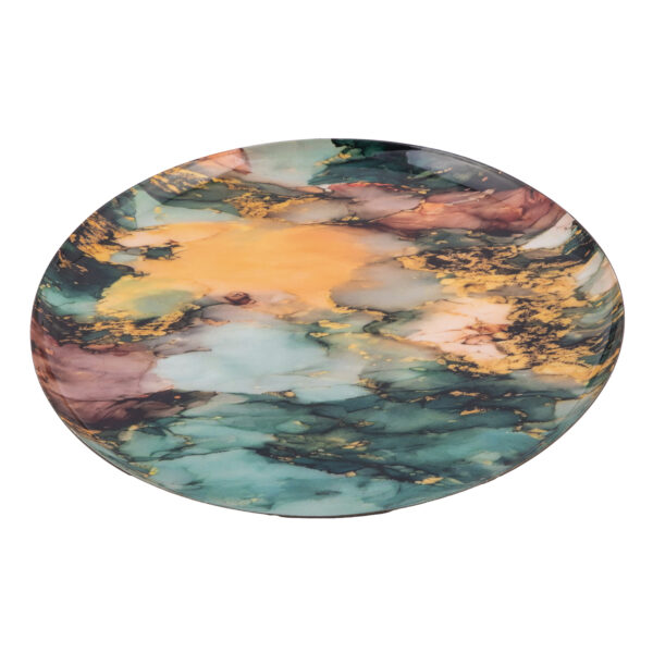 Metal Iron Serving Tray – Marble Pattern Tray, 25 Cm Round Serving Dish, Teal Green and Gold Abstract Design Tray for Serving
