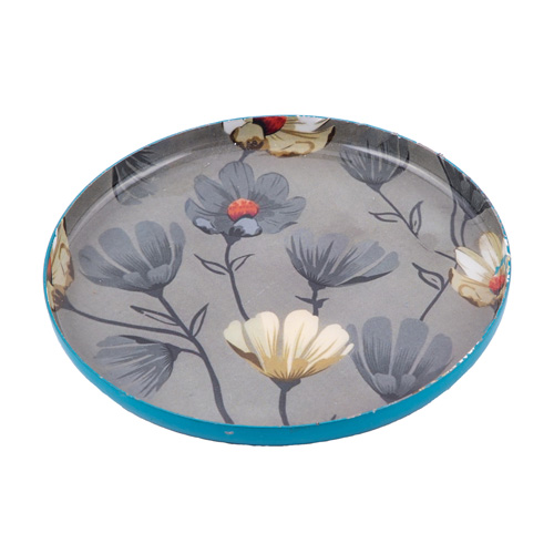 Modern Botanical Iron Tray with Grey & Cream Floral Design and Turquoise Rim (10 cm)
