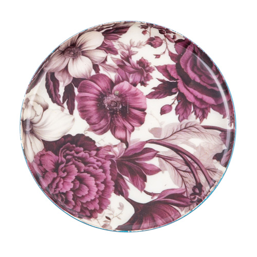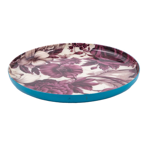 Artistic Round Iron Trinket Tray with Purple & Mauve Floral Print and Turquoise Rim (10 cm)