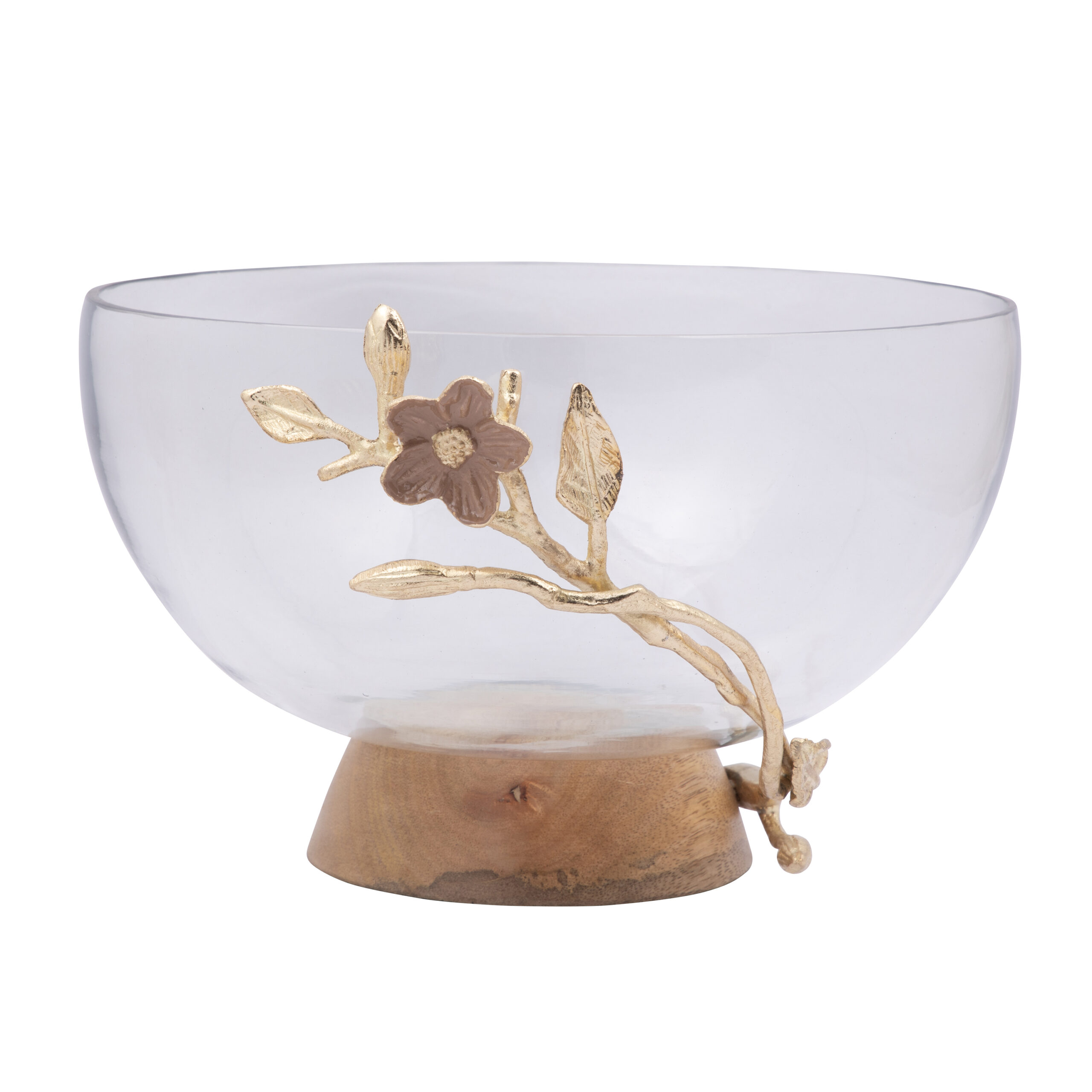 Luxury Glass Bowl with Aluminium Lid & Wooden Base – Large Decorative Fruit Bowl with Gold Floral Stem – Elegant Home Décor & Serving Dish