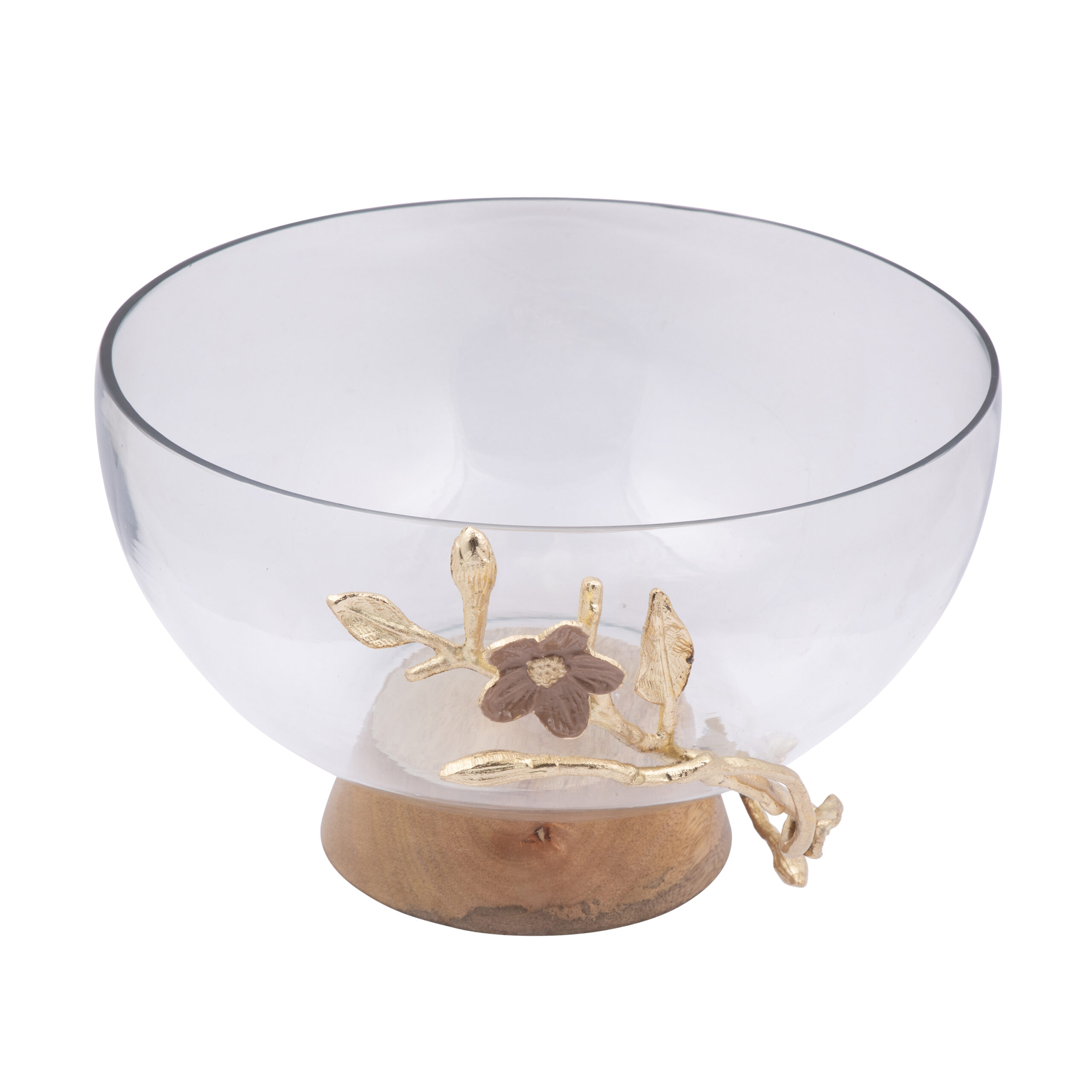 Premium glass bowl with natural wooden base and aluminium floral lid