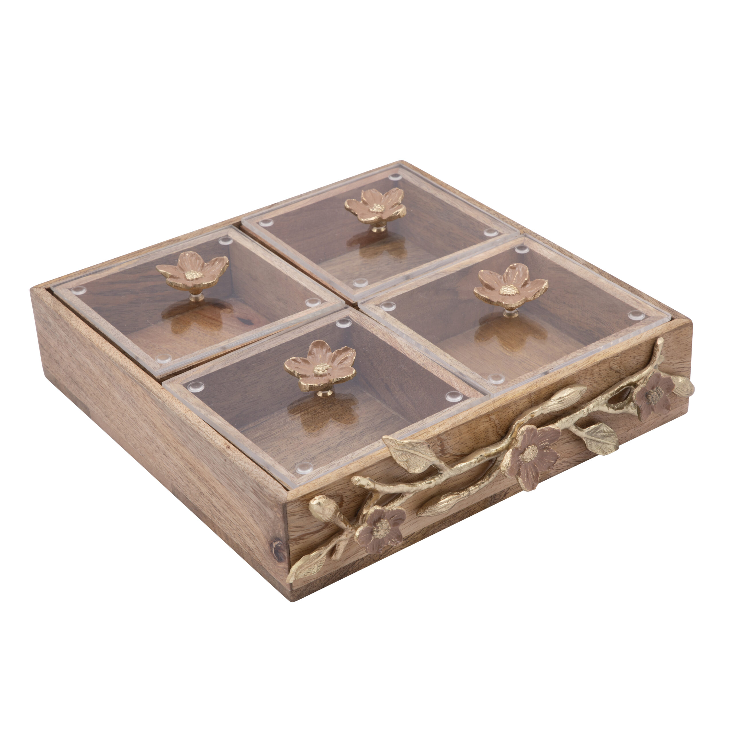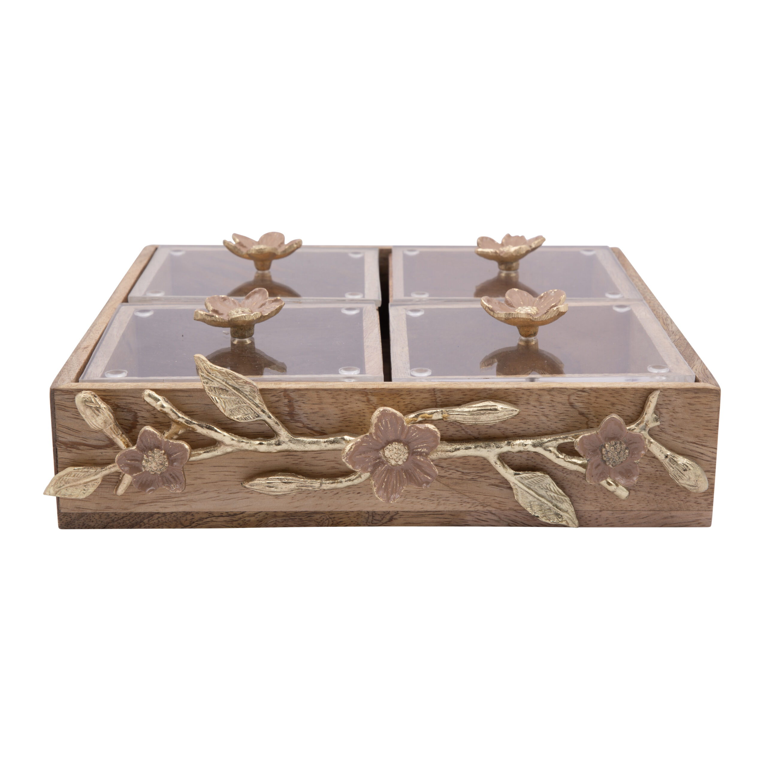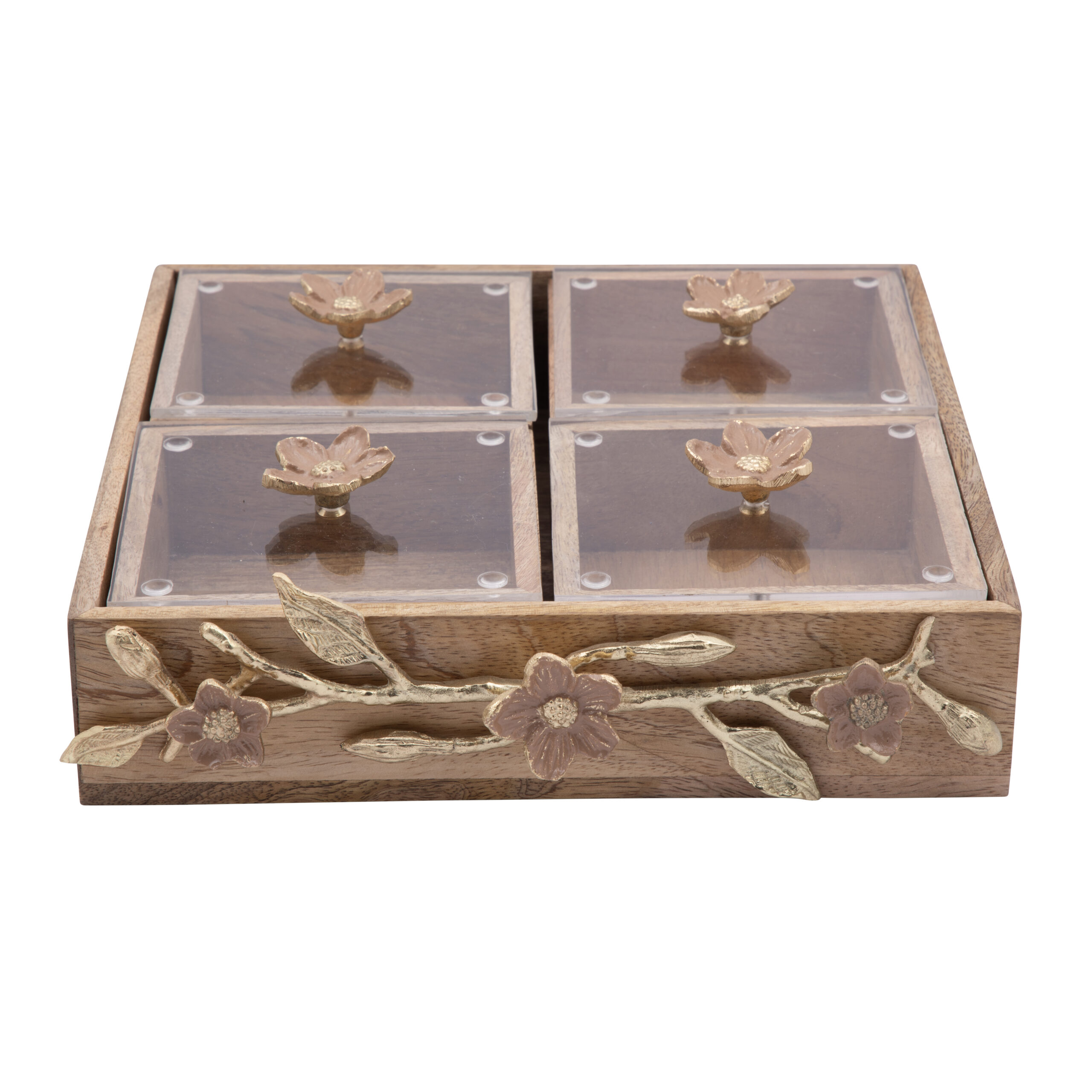 Luxury Wooden Dry Fruit Box with Acrylic Lid & Metal Leaf – 6 Compartment Designer Storage Box for Snacks, Dry Fruits & Gifting