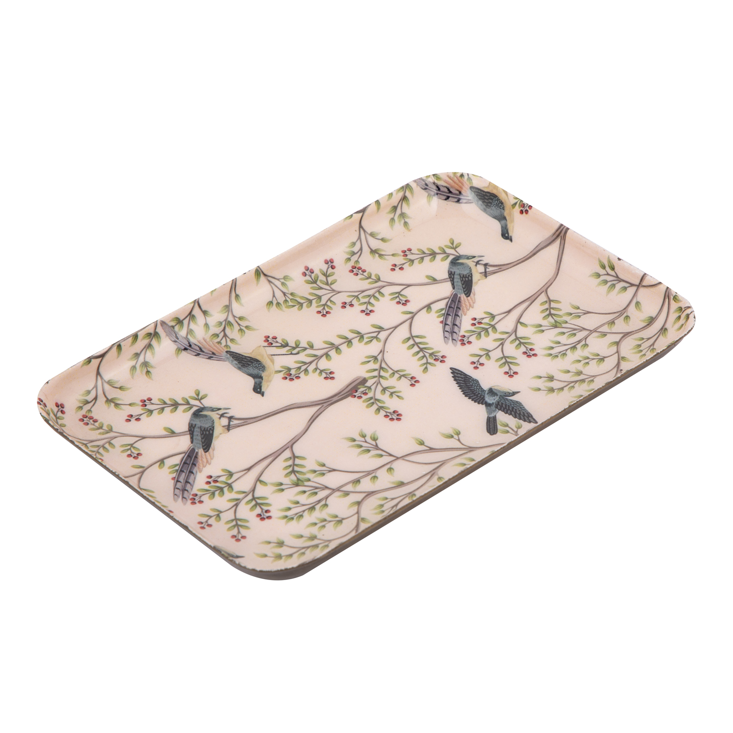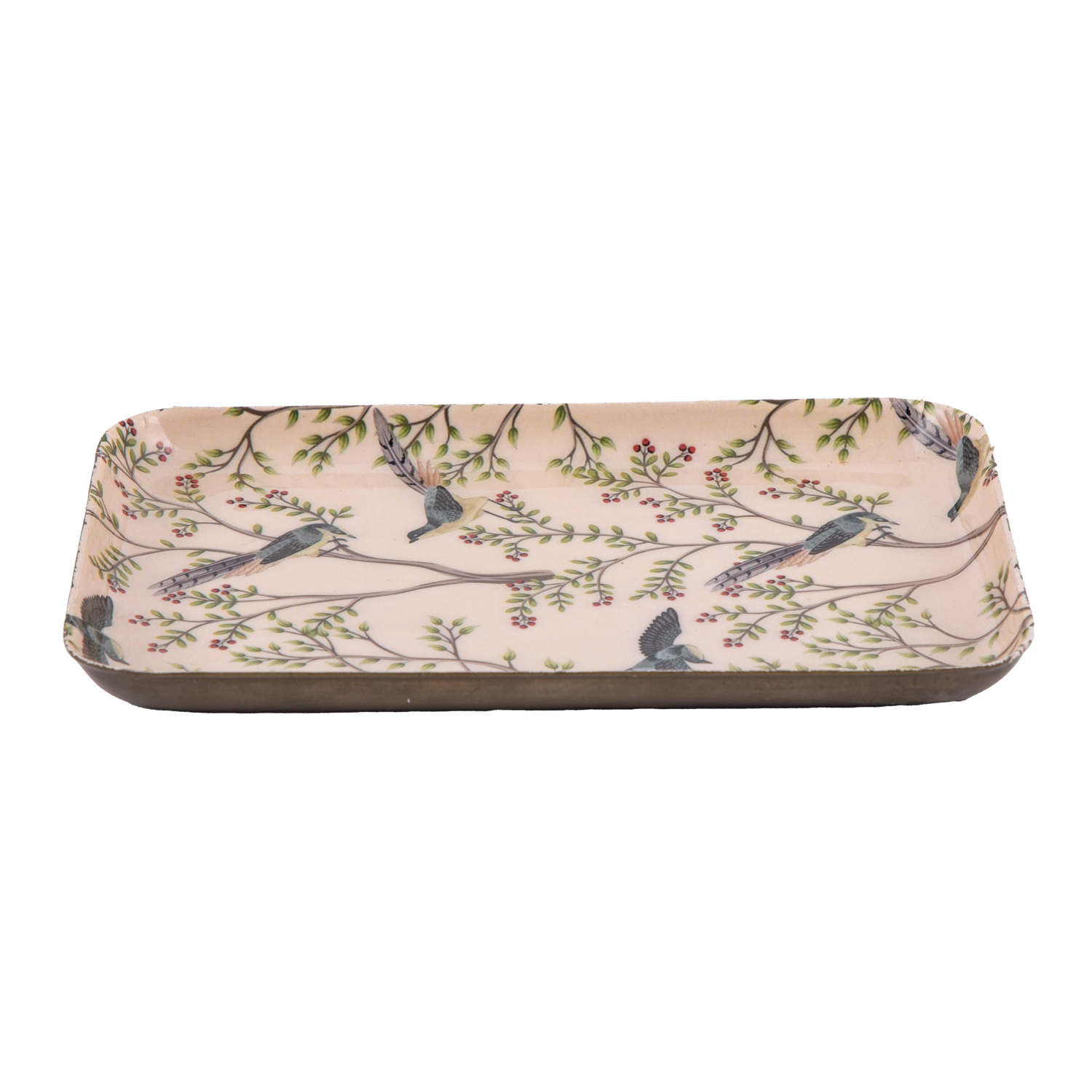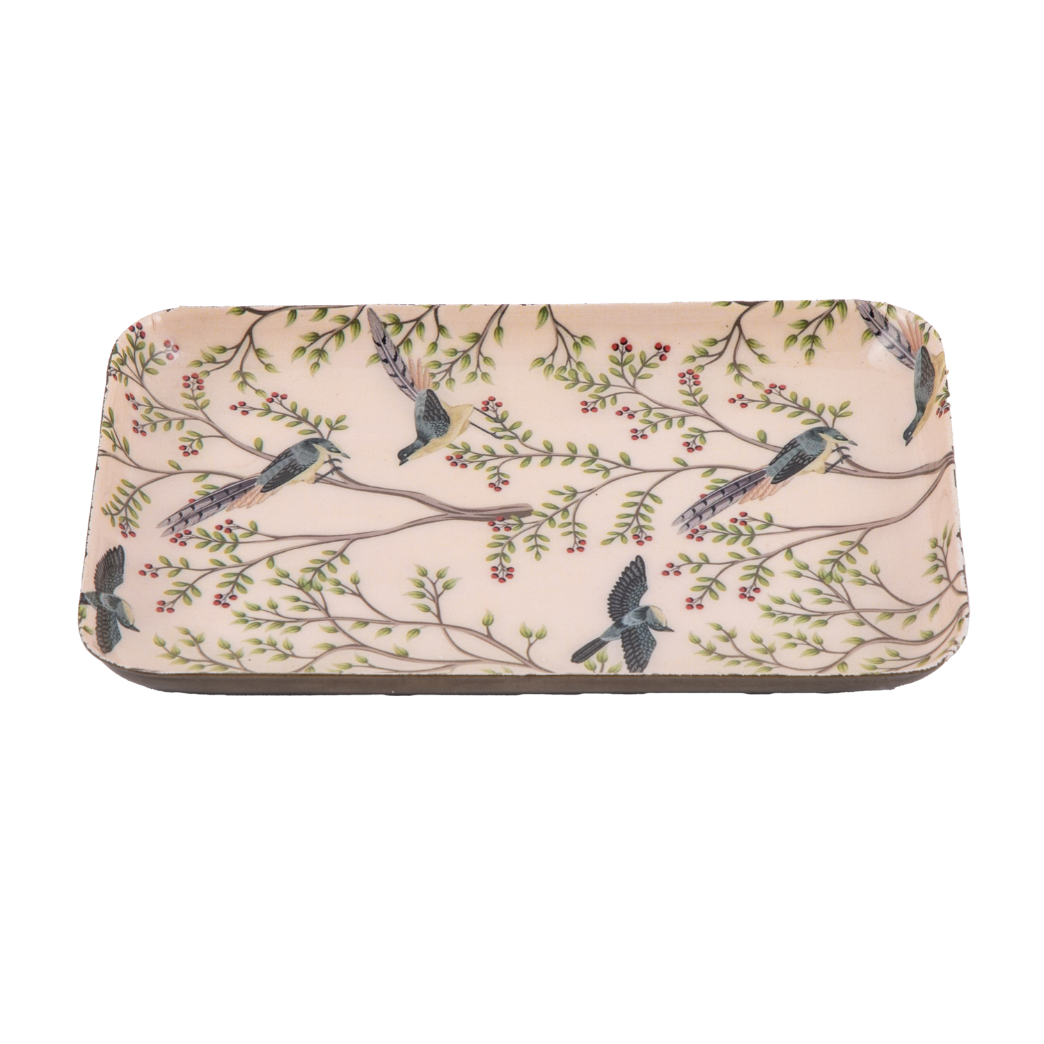 Metal Iron Serving Tray – 15×10 Cm Rectangular Bird and Berry Print, Pink Floral Design Decorative Tray for Serving