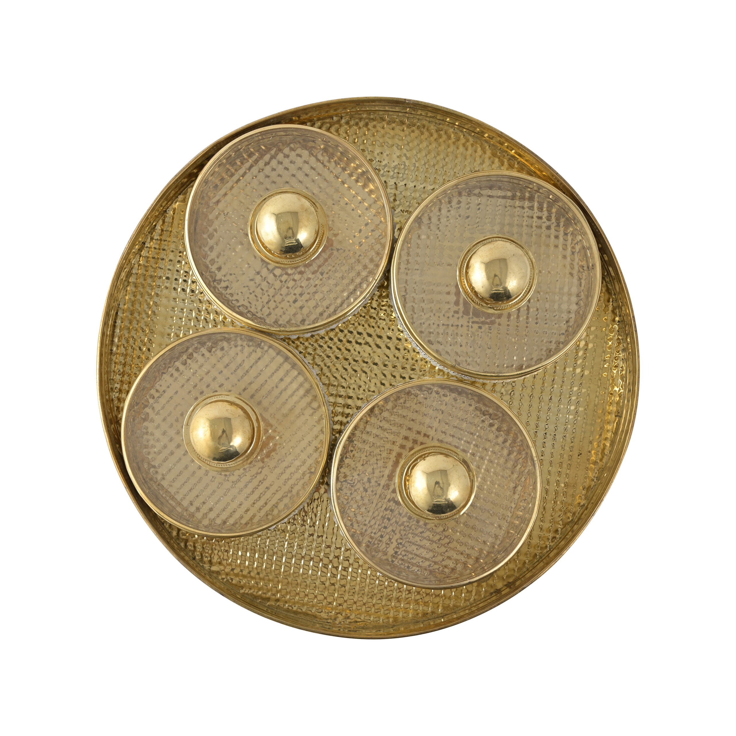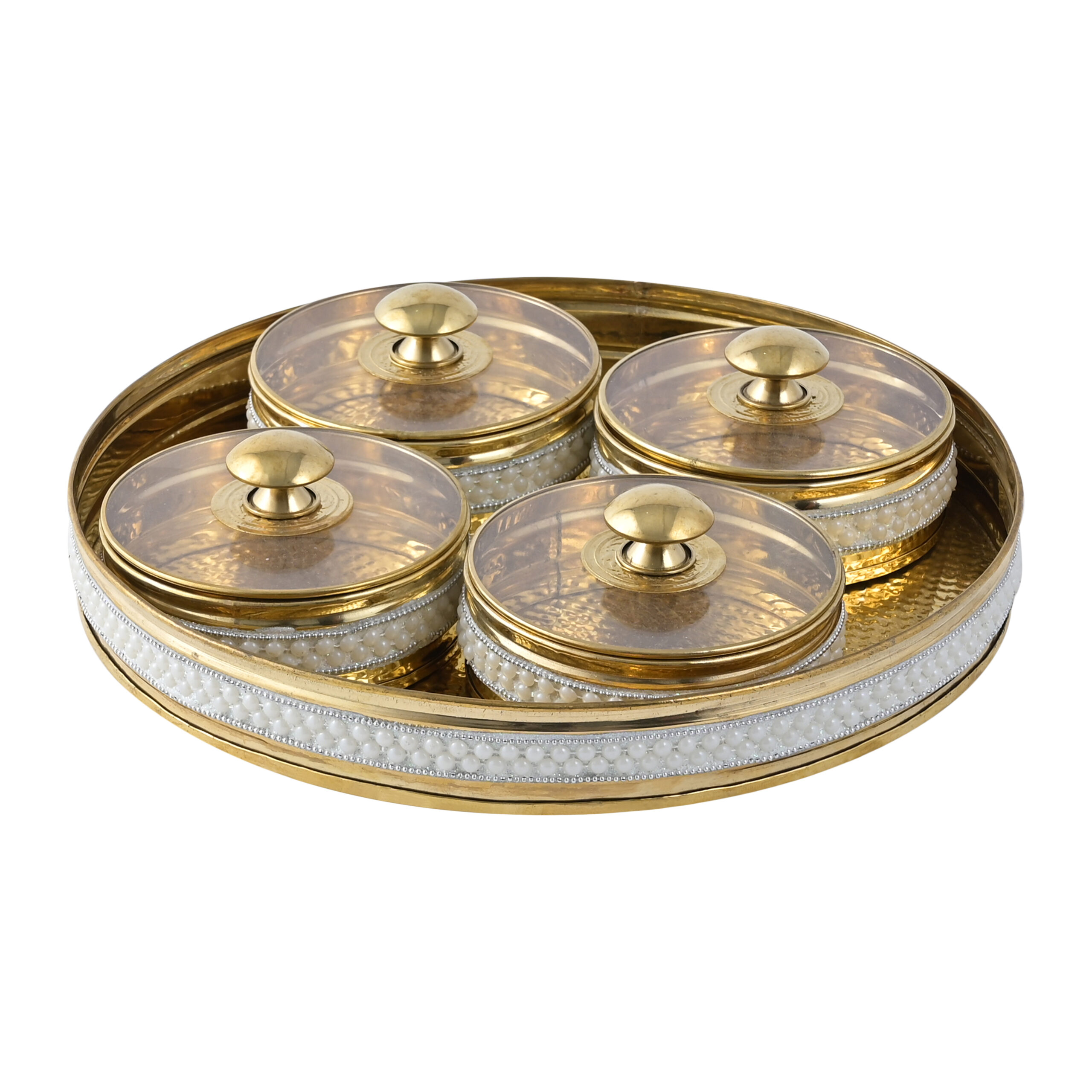 Premium Brass Dry Fruit Box – 4-Container Round Storage with White Beaded Border | Decorative Serving Box with Acrylic Lids for Dry Fruits, Sweets & Snacks