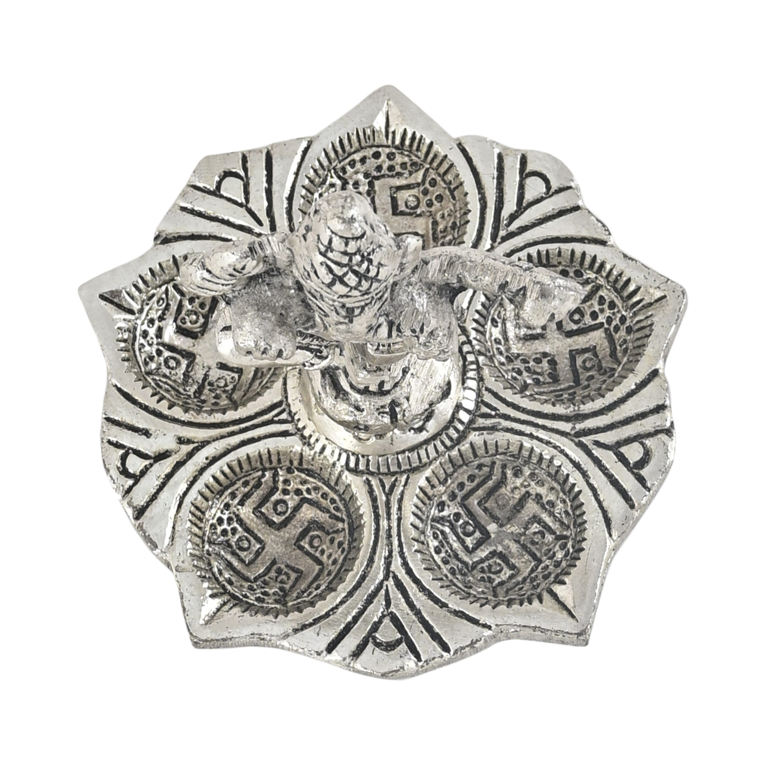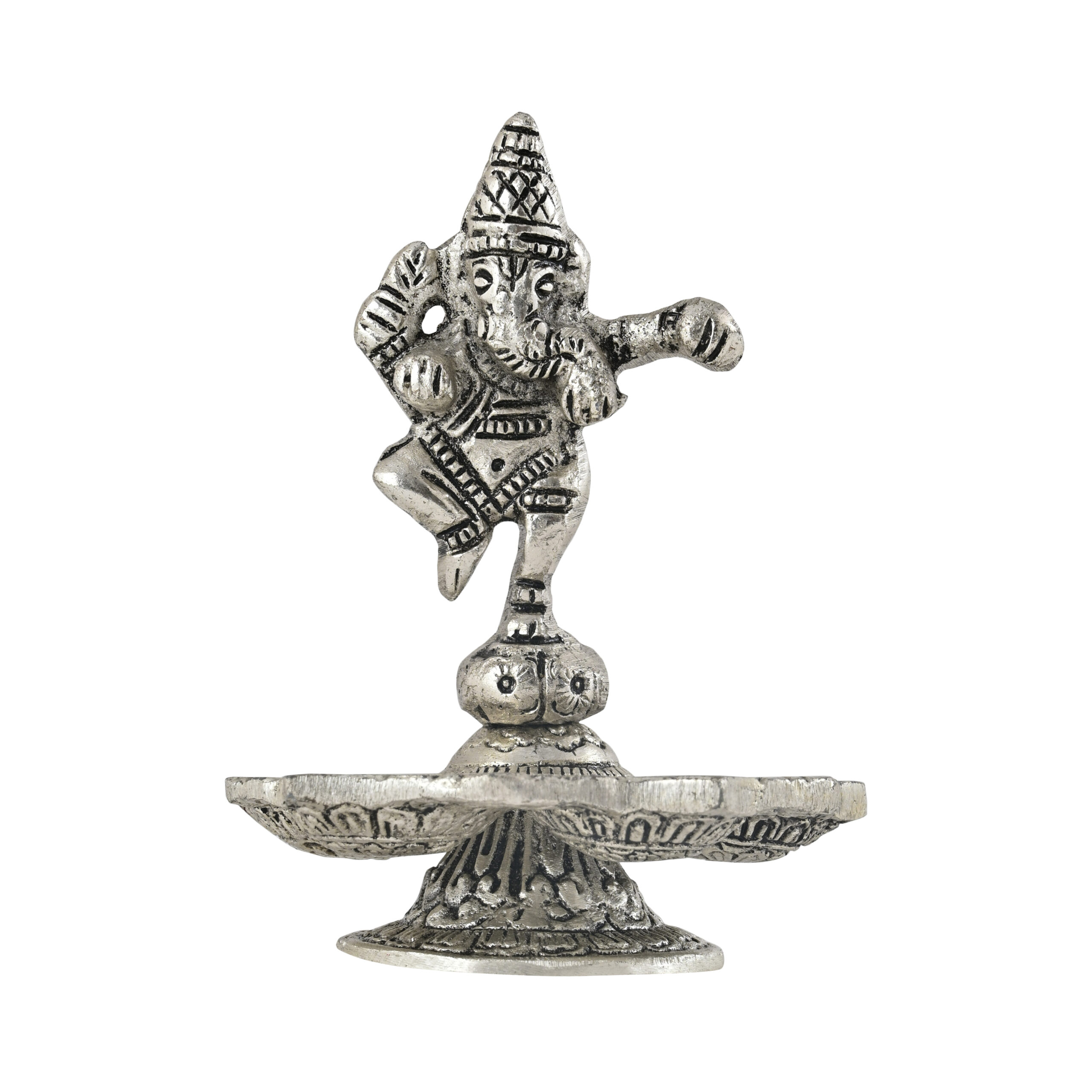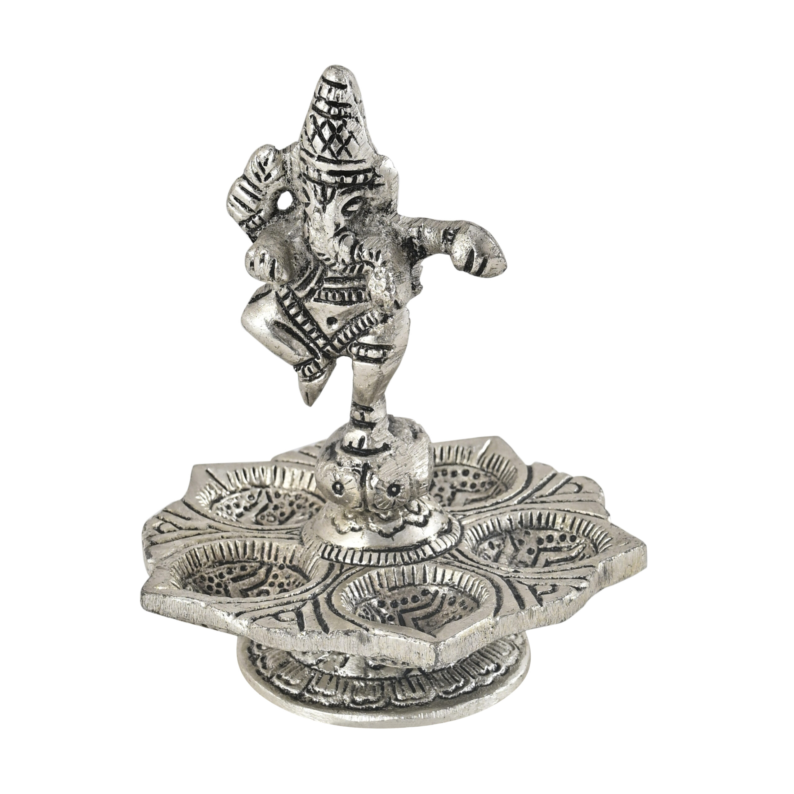The Divine Series Dancing Ganesha with Five-Wick Diya – Silver Antique Pooja Article