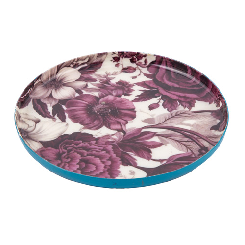 Artistic Round Iron Trinket Tray with Purple & Mauve Floral Print and Turquoise Rim (10 cm)